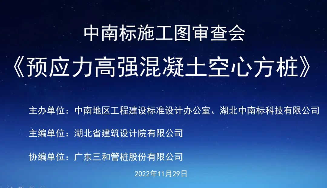2022年11月29日上午,中南標辦組織召開中南標通用圖《預應力高強混凝土空心方樁》線上施工圖審查會。審查專家組成員河南省建筑設計研究院有限公司副總工程師周集建、中南建筑設計院股份有限公司副總工程師李宏勝、湖南省建筑設計院集團股份有限公司副總工程師劉建文、廣東省建筑設計研究院有限公司結構總工程師李寧、華藍設計(集團)有限公司總工程師劉宏、海南省設計研究院有限公司總工程師張元平、圖集主編單位湖北省建筑設計院有限公司副總經理、總工何曉偉及編制組全體成員、協編單位廣東三和管樁股份有限公司代表等17人參加本次會議。