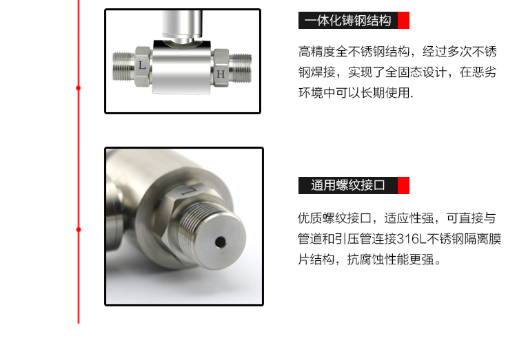 SIN-6100系列一體化差壓變送器采用OEM硅壓阻式差壓充油芯體組裝而成。外殼為全不銹鋼結(jié)構(gòu),兩個(gè)壓力接口為螺紋連接,可直接安裝在測量管道上或通過引壓管連接。