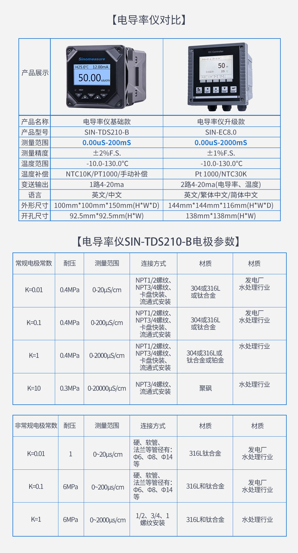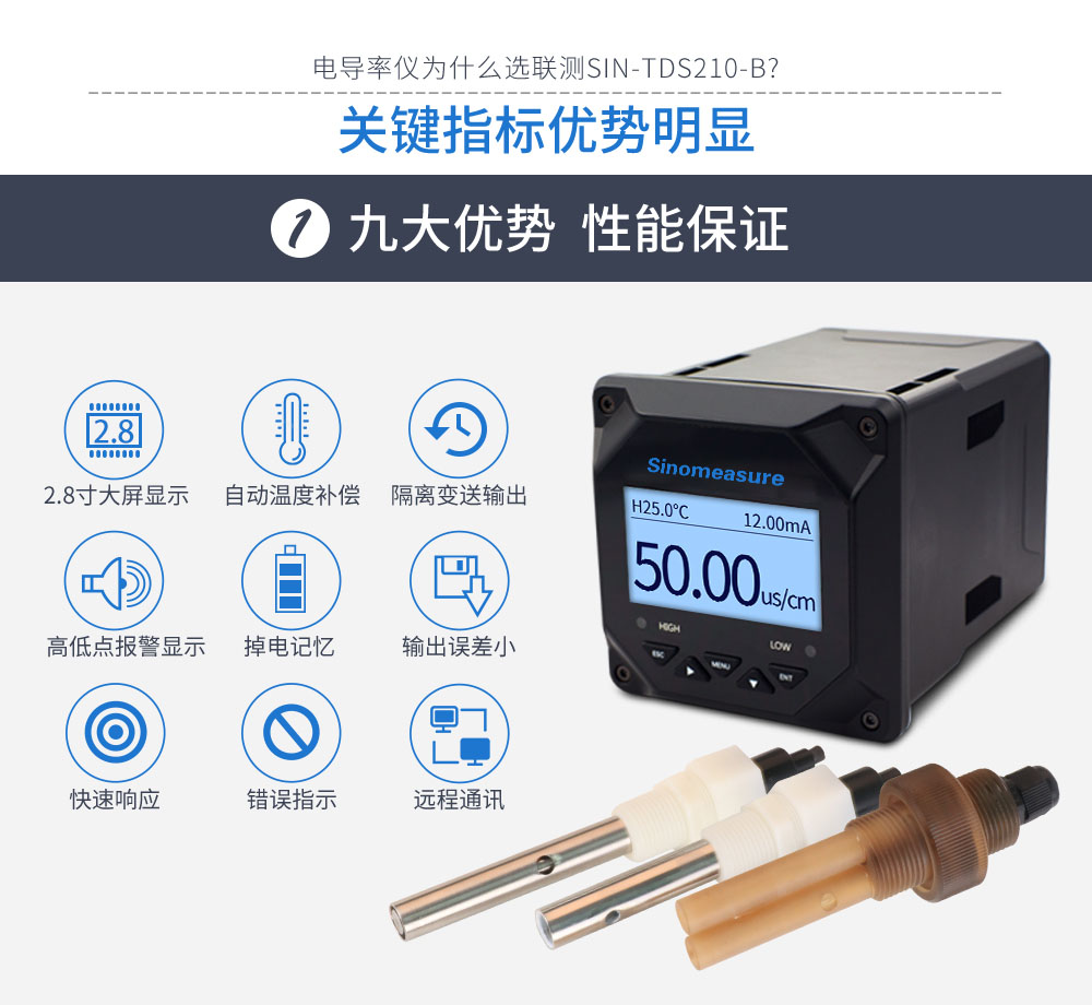 在線電導率儀是新一代全中文微機型儀表,具有全中文顯示、中文菜單式操作、全智能、多功能、測量性能高、環境適應性強等特點。二次表配上常數為1.0或10的電極可測量一般液體的電導率;配上0.1或0.01的電極,能準確測量純水的電導率,特別適用于電廠鍋爐給水和蒸汽冷凝水等高純水電導率的在線連續監測。 聯測_SIN-TDS210-B在線電導率儀 EC儀 TDS 電鍍行業、污水、循環水等檢測_
