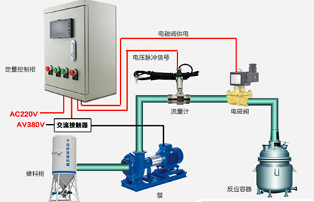 一般的定量控制系統是由流量計、流量積算儀、電磁閥和定量控制箱等裝置組成,可實現對流體的定量計量、定量灌裝、定量配料等過程的控制。結構如圖所示: