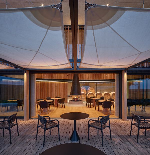周圍地區被各種灌木和成熟的樹木精心點綴,有助于創造一個最佳的微氣候。酒廠戰略性地位于葡萄園之中,最大限度地減少了對原材料和工人的運輸需求。生產區巧妙地位于地下,而客戶區則通過玻璃幕墻擁抱自然陽光,利用被動能源來減少能源消耗。為了防止在炎熱的夏季出現過熱現象,該酒廠采用了隔熱的三層玻璃,結合木質橡木板條、充足的屋頂懸垂和帶防水布的涼棚遮陽。這些措施確保了最佳的溫度調節,同時保持了一個舒適的室內環境。雨水被收集在一個儲水池中,用于灌溉葡萄園。