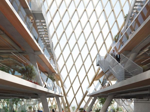 OMA設(shè)計(jì)的聯(lián)合信貸銀行的辦公室位于廣場(chǎng)之上,被安置在一個(gè)高于地面22米的梯形體中。雖然該設(shè)計(jì)向傳統(tǒng)的慕尼黑屋頂致敬,但體量的幾何形狀主要受環(huán)境因素的影響。外墻的傾斜度有利于改善附近的空氣流動(dòng),而梯形結(jié)構(gòu)中的三個(gè)三角形切口使充足的自然光滲透到建筑深處,為工作和休閑空間創(chuàng)造了理想的室內(nèi)氣候。