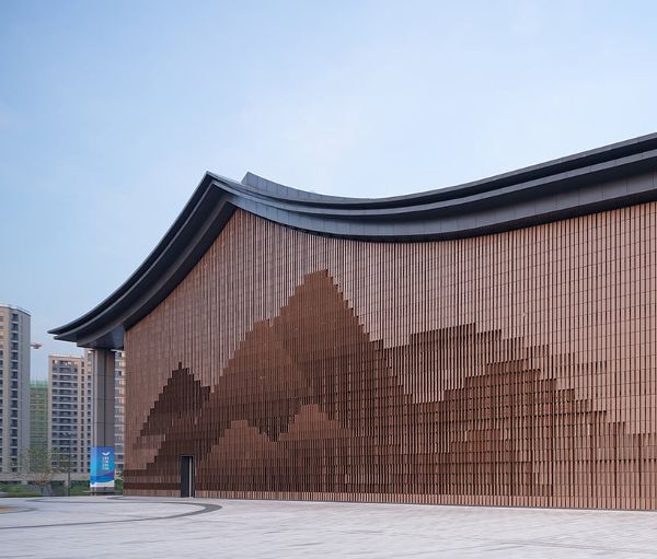 設(shè)計(jì)團(tuán)隊(duì)借鑒黃公望的《富春山居圖》,采用參數(shù)化和像素化的手法,從抽象過(guò)渡到具象。建筑外立面采用模塊化和低成本的標(biāo)準(zhǔn)構(gòu)件,放棄了高科技方法,轉(zhuǎn)而追求簡(jiǎn)潔。通過(guò)使用超過(guò)37,000個(gè)可在不同角度旋轉(zhuǎn)的單元模塊,建筑表面重新演繹了富春江沿岸的自然風(fēng)光。這些可移動(dòng)的百葉以15個(gè)簡(jiǎn)單的旋轉(zhuǎn)角度運(yùn)行,創(chuàng)造出迷人的效果。