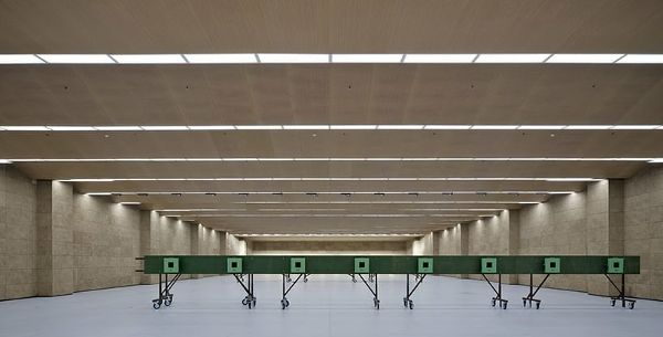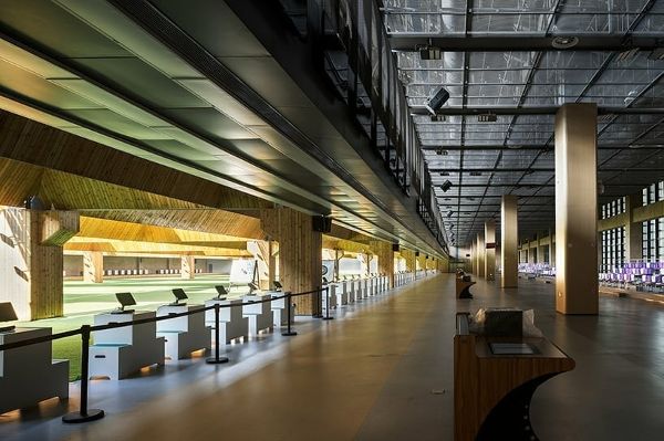 為了適應(yīng)場(chǎng)地的不同標(biāo)高并保護(hù)周?chē)淖匀画h(huán)境,該設(shè)計(jì)結(jié)合了五個(gè)標(biāo)高平臺(tái)。這些平臺(tái)利用二層平臺(tái)組織人流,有效地連接了三個(gè)比賽項(xiàng)目。射擊項(xiàng)目的預(yù)賽區(qū)和決賽區(qū)垂直分布,共同功能集中在新聞和安保中心,優(yōu)化了場(chǎng)地的利用率。在建筑造型上,射擊館平面方正,體量大,多節(jié)坡屋頂與周?chē)襟w相協(xié)調(diào)。