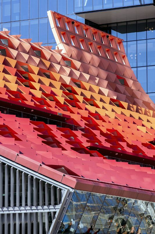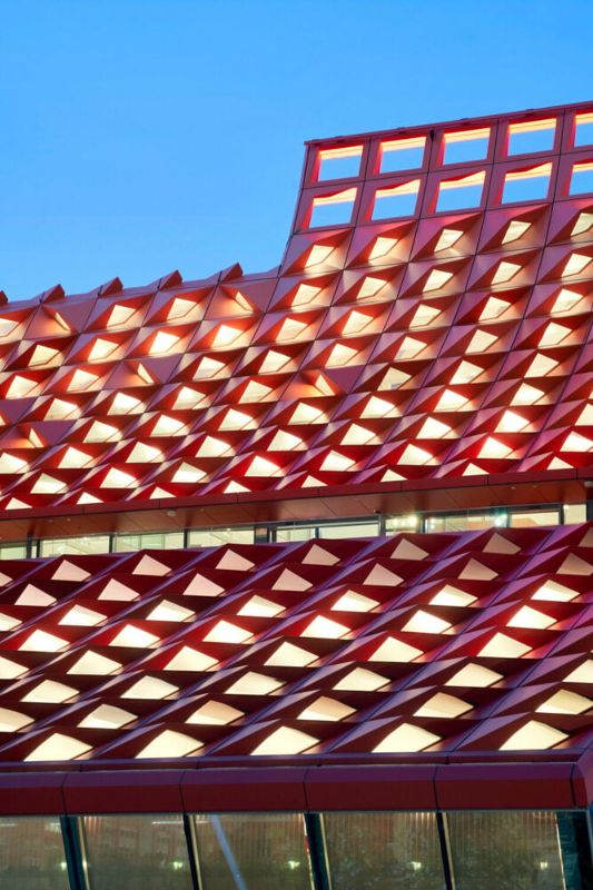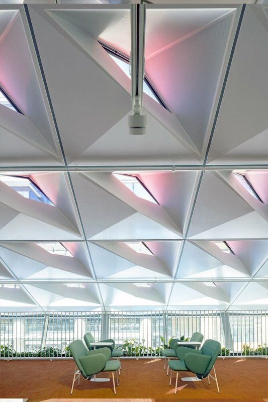 建筑的斜面設(shè)計(jì)兼具功能性和美觀性。它促進(jìn)了自然通風(fēng),讓空氣向尖頂上升,而尖頂則像煙囪一樣抽走熱氣和污濁空氣,從而減少了對空調(diào)的需求??刹僮鞯陌偃~窗進(jìn)一步加強(qiáng)了通風(fēng)效果,營造出舒適和可持續(xù)發(fā)展的室內(nèi)環(huán)境。屋頂?shù)娜切问艿教栜壽E的影響,形成了一種動態(tài)的色彩交織,就像伸手可及的云朵。從當(dāng)?shù)氐闹参镏屑橙§`感,所選用的紅色在周圍的綠色和灰色塔樓中顯得格外醒目。