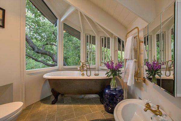 透過270扇比利時鉛制彩色玻璃窗可欣賞到樹木繁茂的景色,而起伏的墻壁則采用威尼斯灰泥裝飾。其他值得注意的元素包括室內竹庭院、室外淋浴和流入鯨尾洞穴的 75 英尺長的游泳池。
