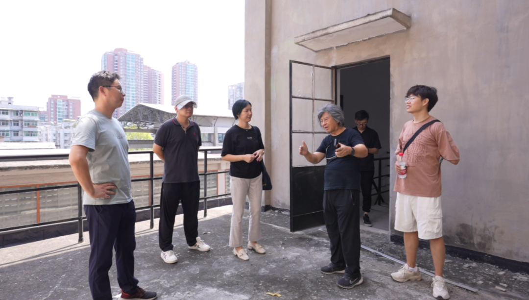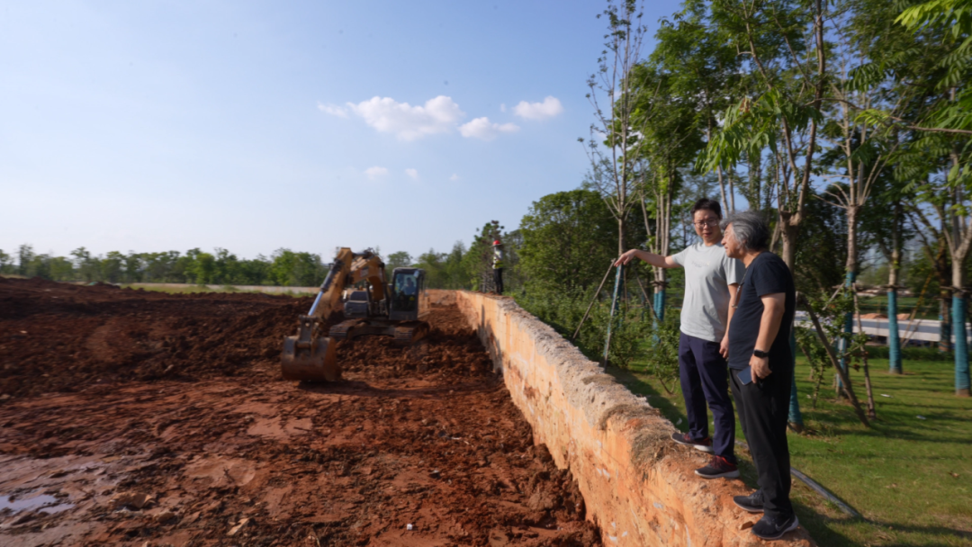 李保峰工作室一天內轉戰多個項目現場開展踏勘工作。在李教授的帶領下,室內設計團隊對烘干車間現場與設計圖紙進行全面細致的對比,結合場地實際情況對設計圖紙進行優化。下午3點,在戶外溫度接近40℃的鄂州紅蓮湖,武漢新城體育公園項目工地現場,工作室設計人員踏上廢棄擋土墻,站在高點,頂著烈日炙烤,同施工現場工作人員一邊了解情況,一邊交流施工技術。
