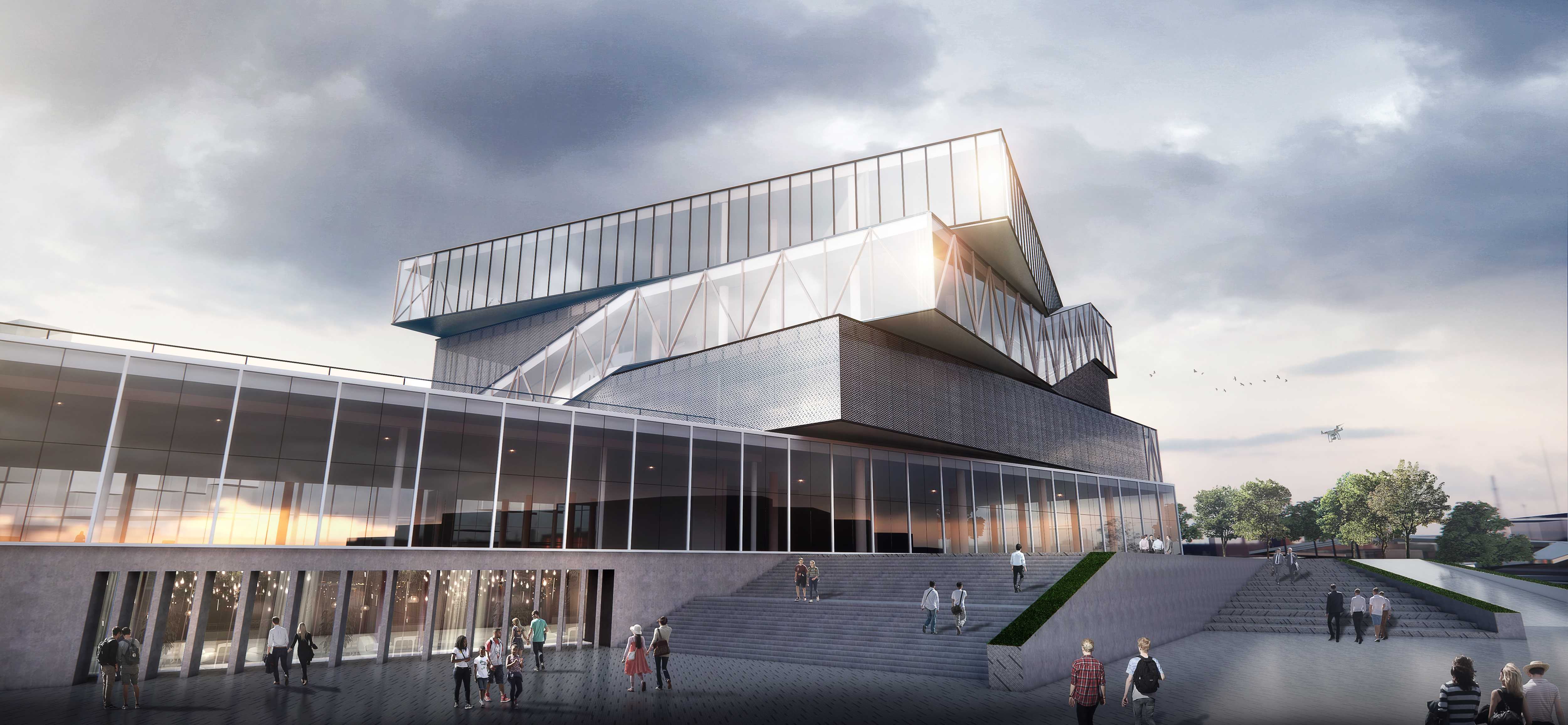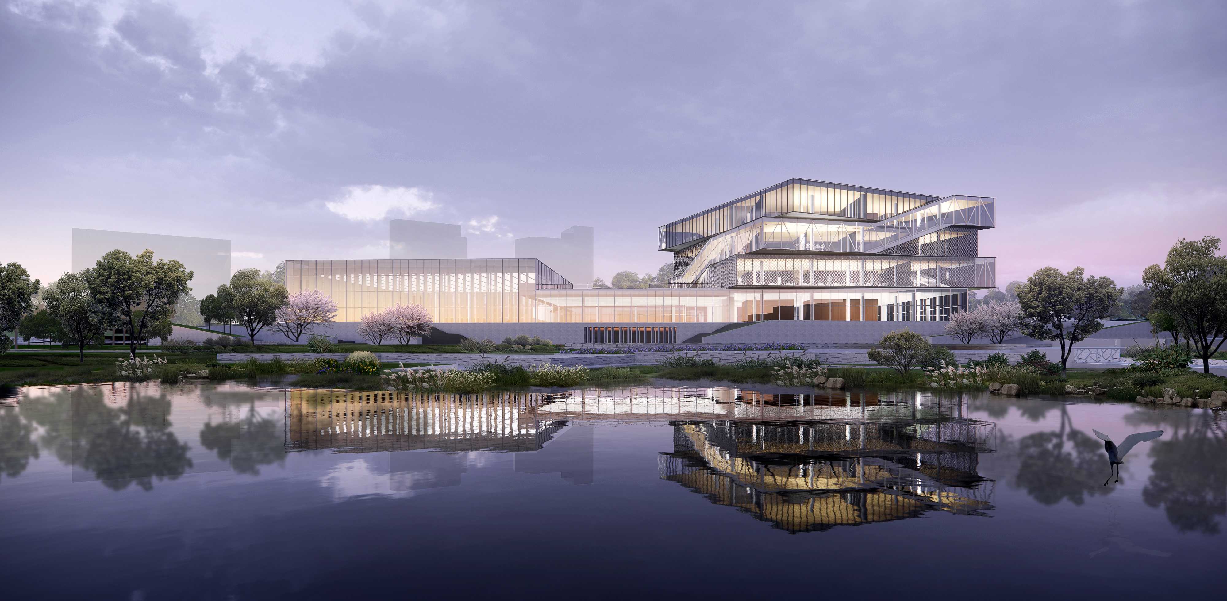 建筑兩端拔高,形成一高一矮兩處高起的體塊,達到形體平衡。高矮體塊分別形成多層塔樓及大跨度空間,滿足展覽辦公等功能需求。多層塔樓層疊旋轉(zhuǎn)后,加入外部樓梯形成連續(xù)的游覽路徑,為欣賞美景時加入運動的動感。