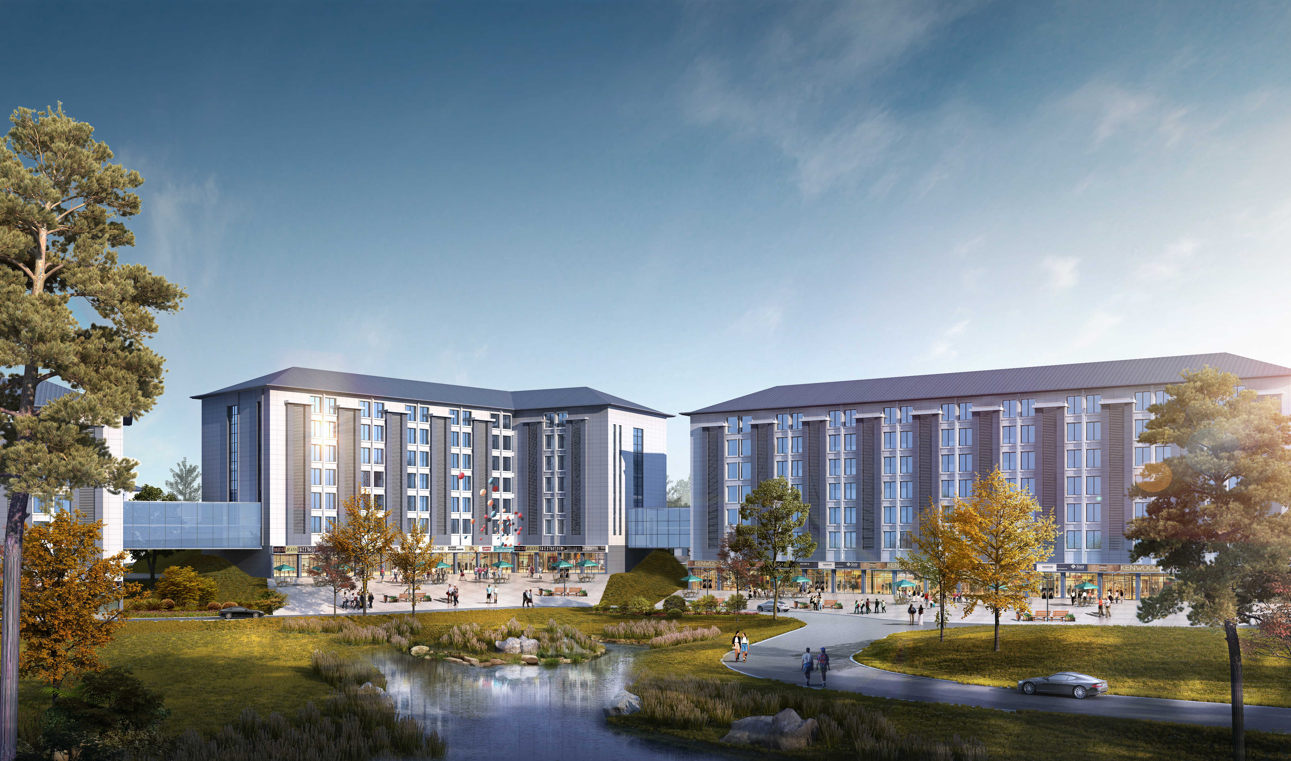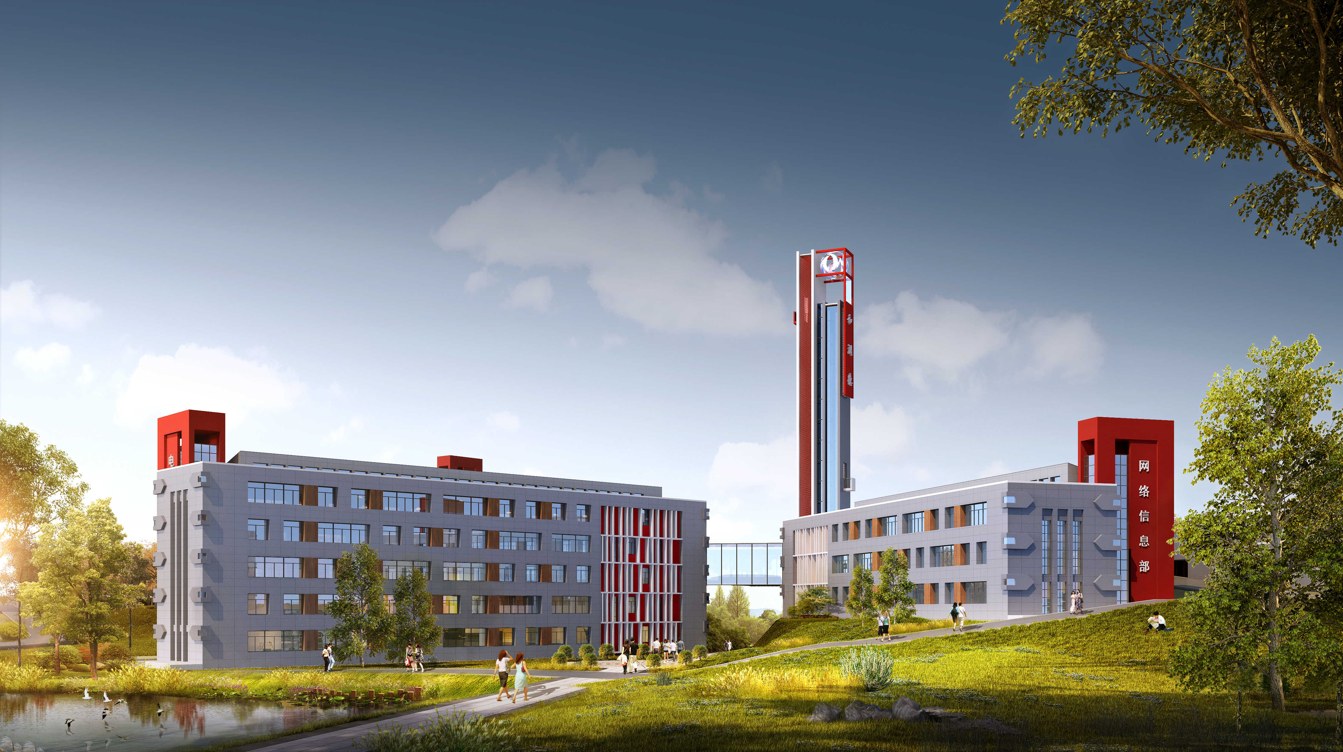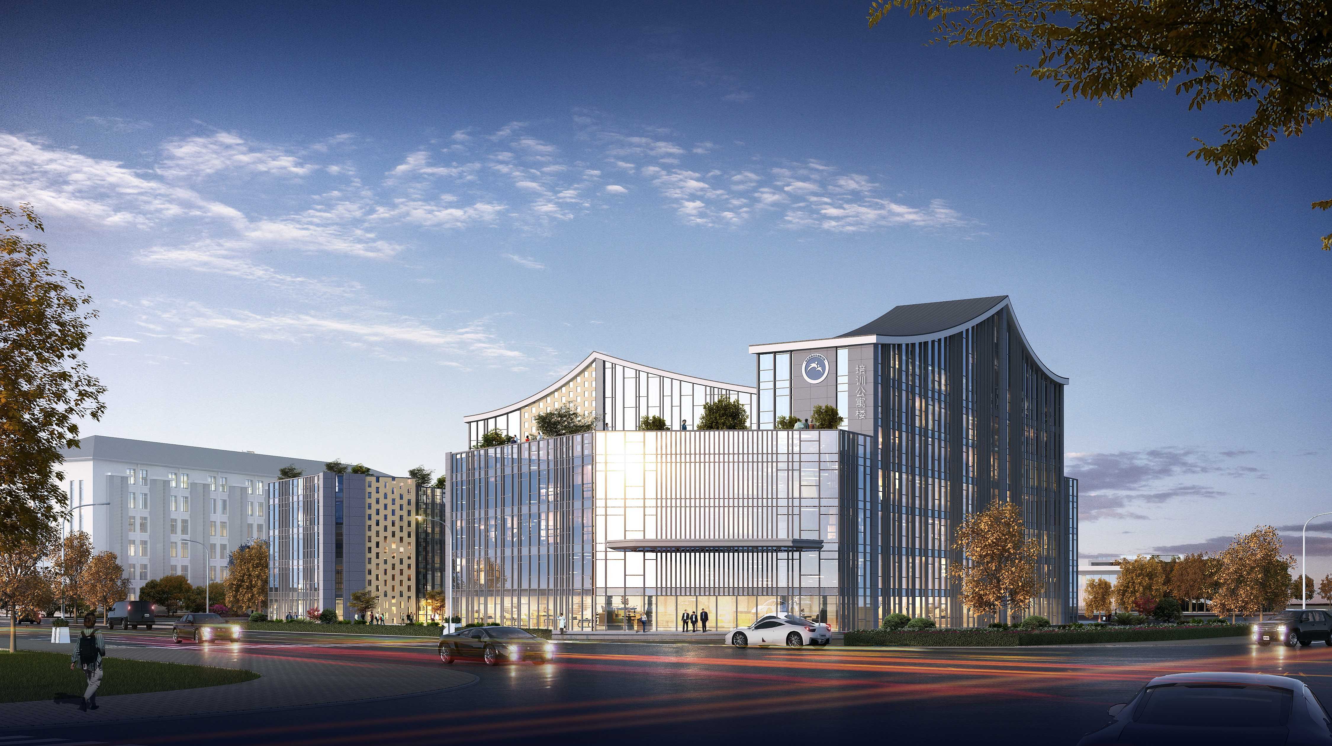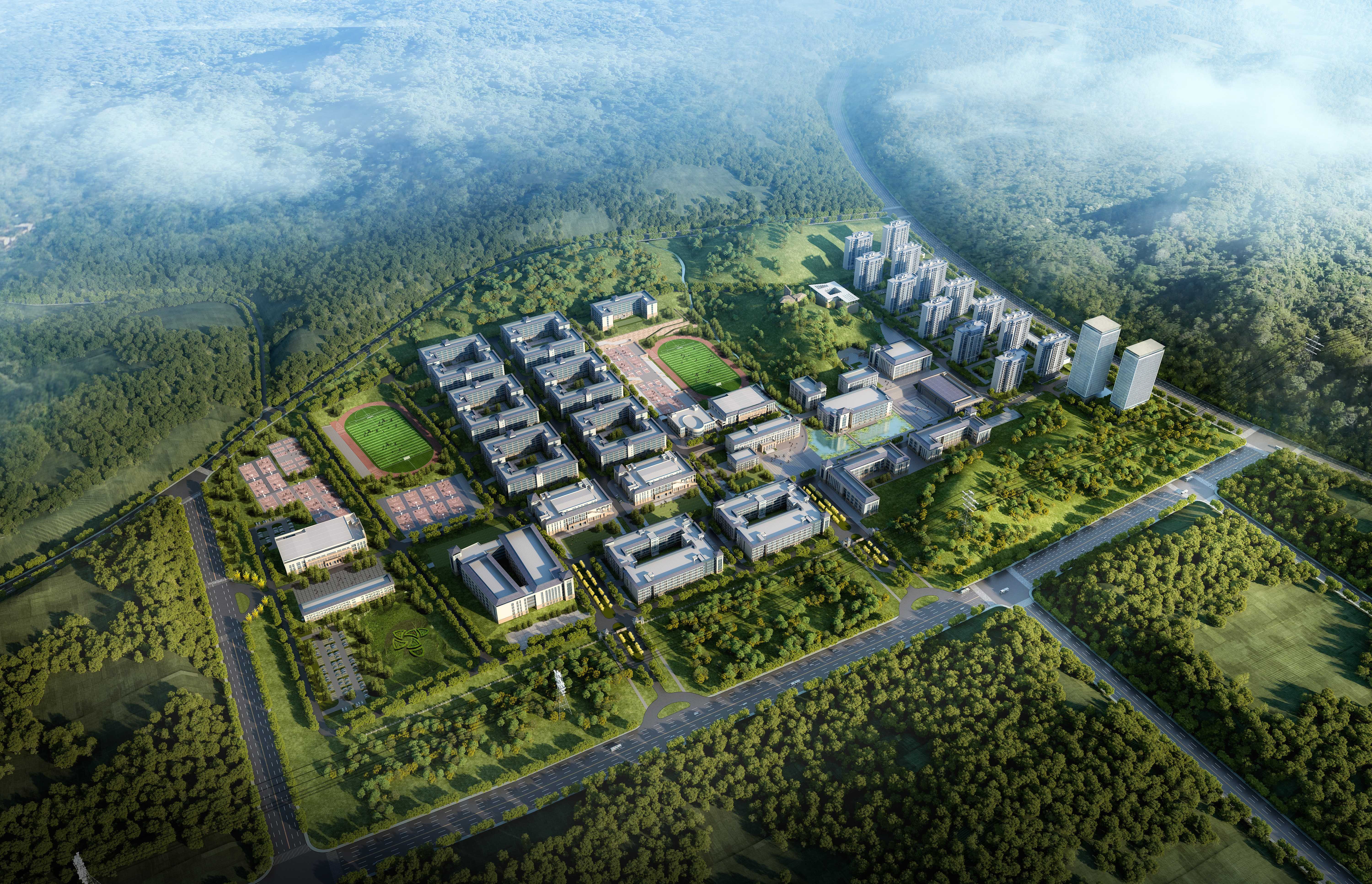 項目總建筑面積166377㎡。主要功能涵蓋派出所、食堂、防汛指揮中心、辦公、宿舍等。工程院方案團隊在總體規劃中,梳山理水,在滿足防洪水位基礎上,最大化保遵循地形,減少土方。注重對建筑之間的外部空間秩序的控制,而不是僅僅考慮設計各個建筑單體的具體形態。校園規劃從傳統的重視單幢建筑設計轉向校園外部空間的創造,規劃強調建構和協助形成一個廣闊的相互聯系的且永久開放的外部空間聯系,并以此作為可持續性發展的框架,把外部空間視為一個與建筑實體相共生、獨立完善的整體。打造全國" 產、學、研、景" 高度融合的生態職校標桿。