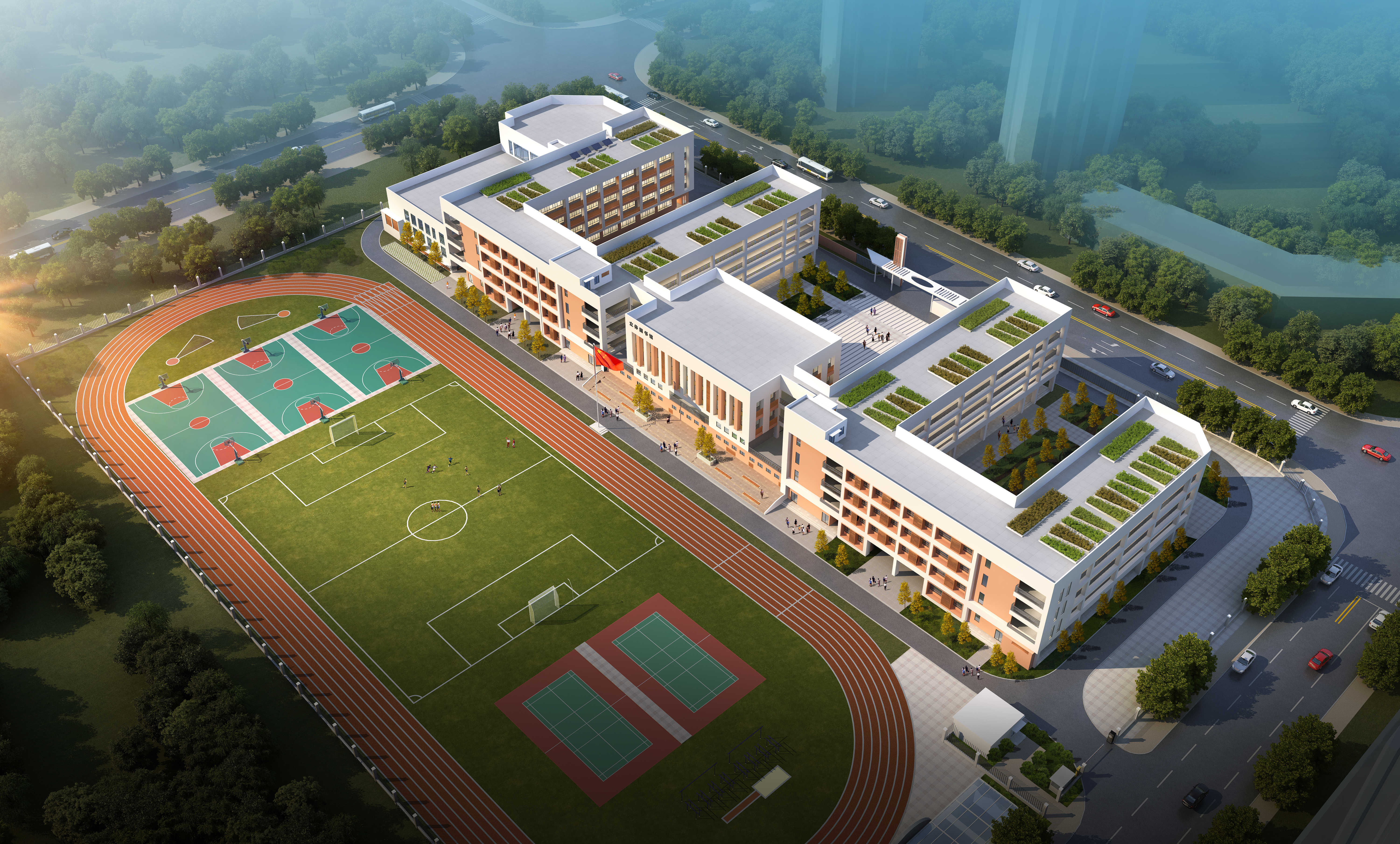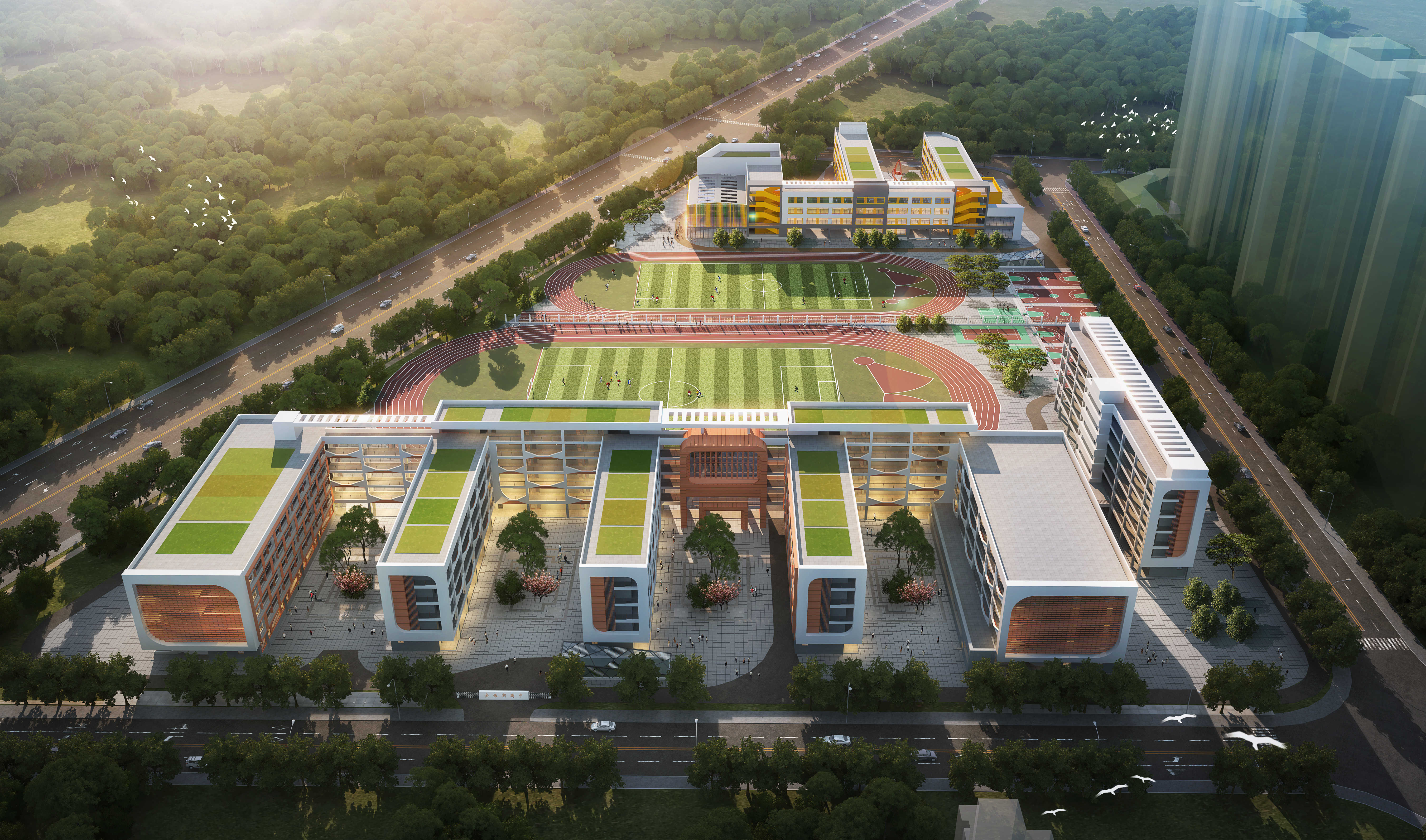 本項目新增建筑面積38500平方米,新增建筑占地面積16625平方米,其中:(1)3#學生公寓10000平方米;(2)食堂3000平方米;(3)學生浴室1000平方米;(4)綜合樓4500平方米;(5)風雨操場3000平方米;(6)體育館6000平方米;(7)圖書館6000平方米;(8)教學樓5000平方米等內容;并新增相關教學設備。工程院設計團隊充分考慮該地塊的地形與周邊現狀情況,努力實現校園內功能布局合理、緊湊;交通流線方便、快捷。在滿足規劃要求的前提下,為學生提供一個“陽光、健康、綠色、舒適”的校園環境。